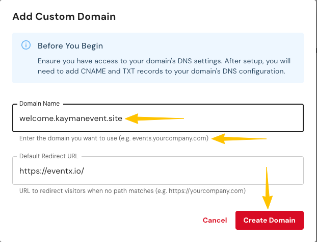 Log in to your domain provider and add the CNAME and TXT record provided by EventX portal.